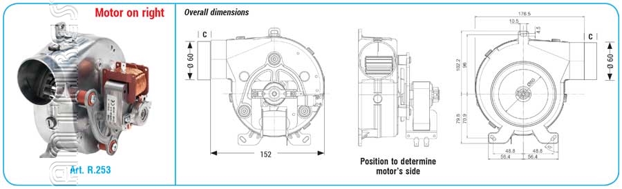 Estrattore di fumo per caldaie con bocca tonda diam. 60 mm, con alette di fissaggio - Tensione: 230V. - 50Hz