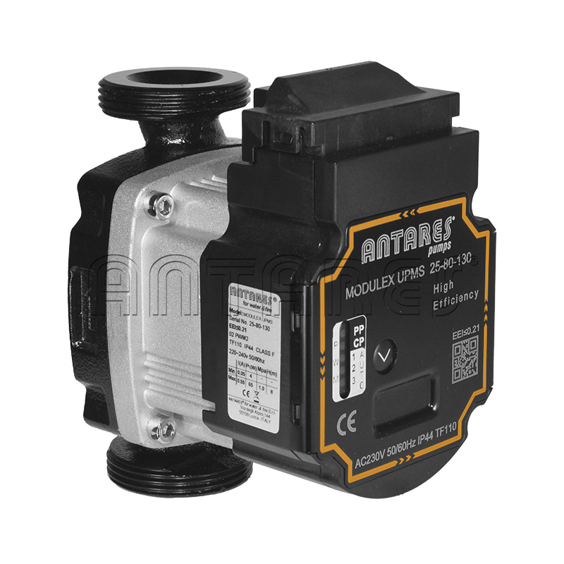 Pompa di circolazione ANTARES tipo MODULEX SOLAR ad alta efficienza energetica con inverter a modulazione di frequenza e con presa di controllo parametrabile PWM2 o PWM1, dotata della funzione AUTO ADAPT autoregolante con e senza collegamento del cavo PWM. Specificamente adatta ad impianti solari.