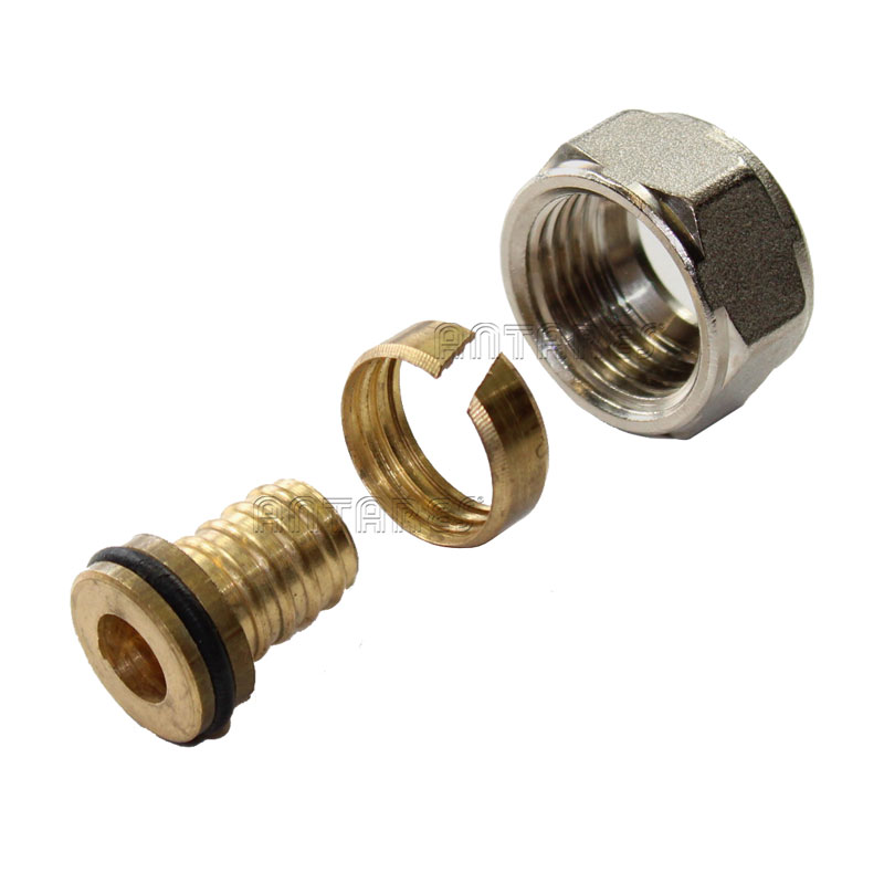 U.017 V. Drukkoppeling in vernikkelde messing voor meerlaagsbuizen.